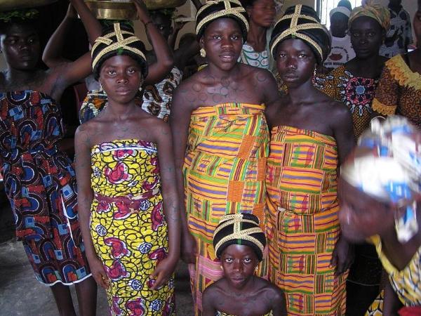 Pakaian tradisional laki-laki biasanya cahaya yang terdiri dari dua bagian apron mirip dengan cawat a digunakan untuk menutupi alat kelamin dan pantat. Desain diciptakan dari karakter dan imajinasi suku-suku pedalaman Afrika. Sekitar 2000 SM pakaian mulai dibuat dengan cara ditenun sehingga dapat.